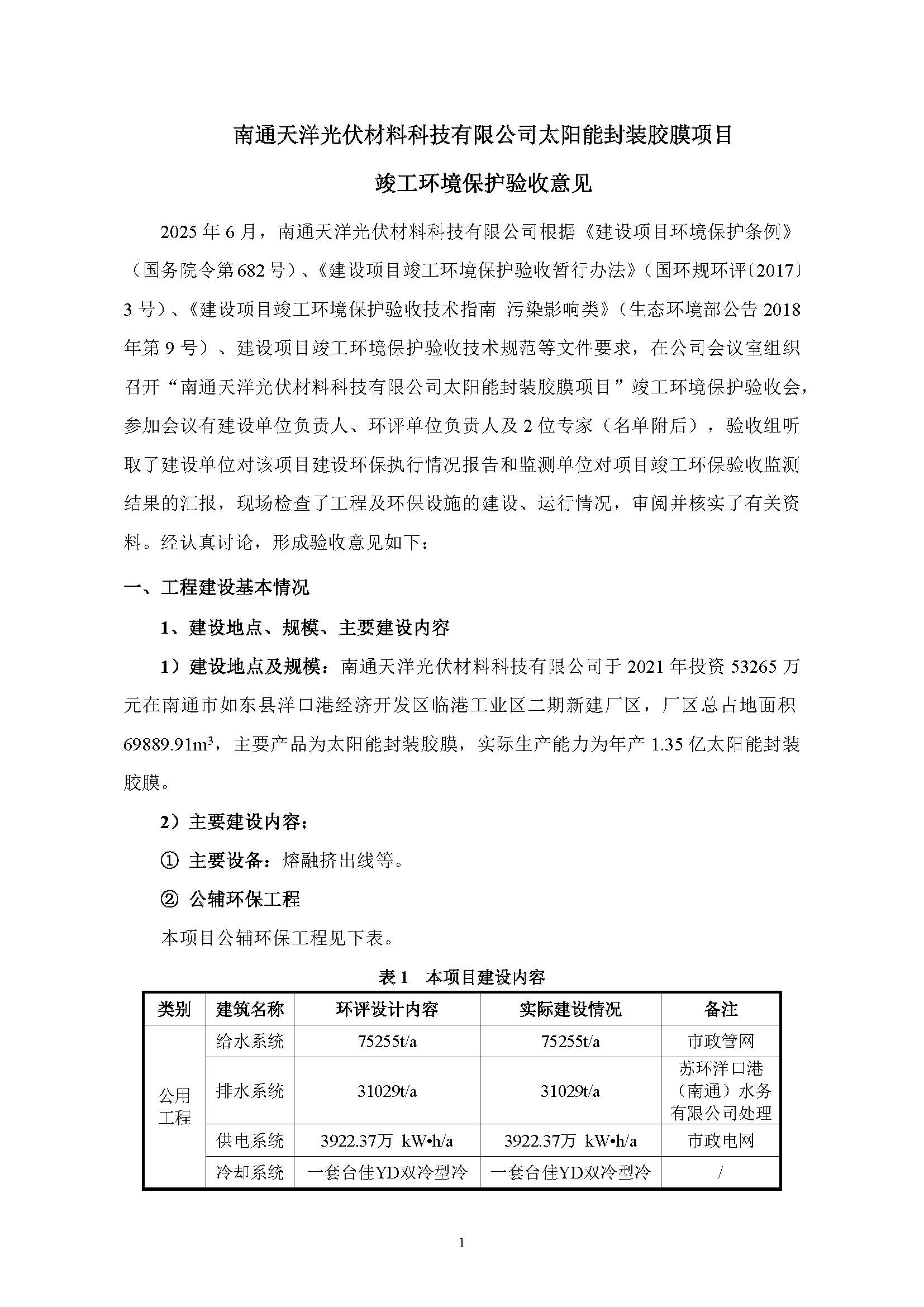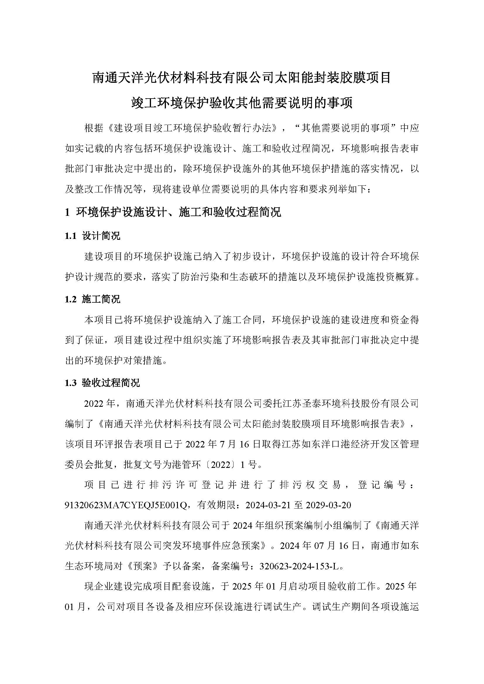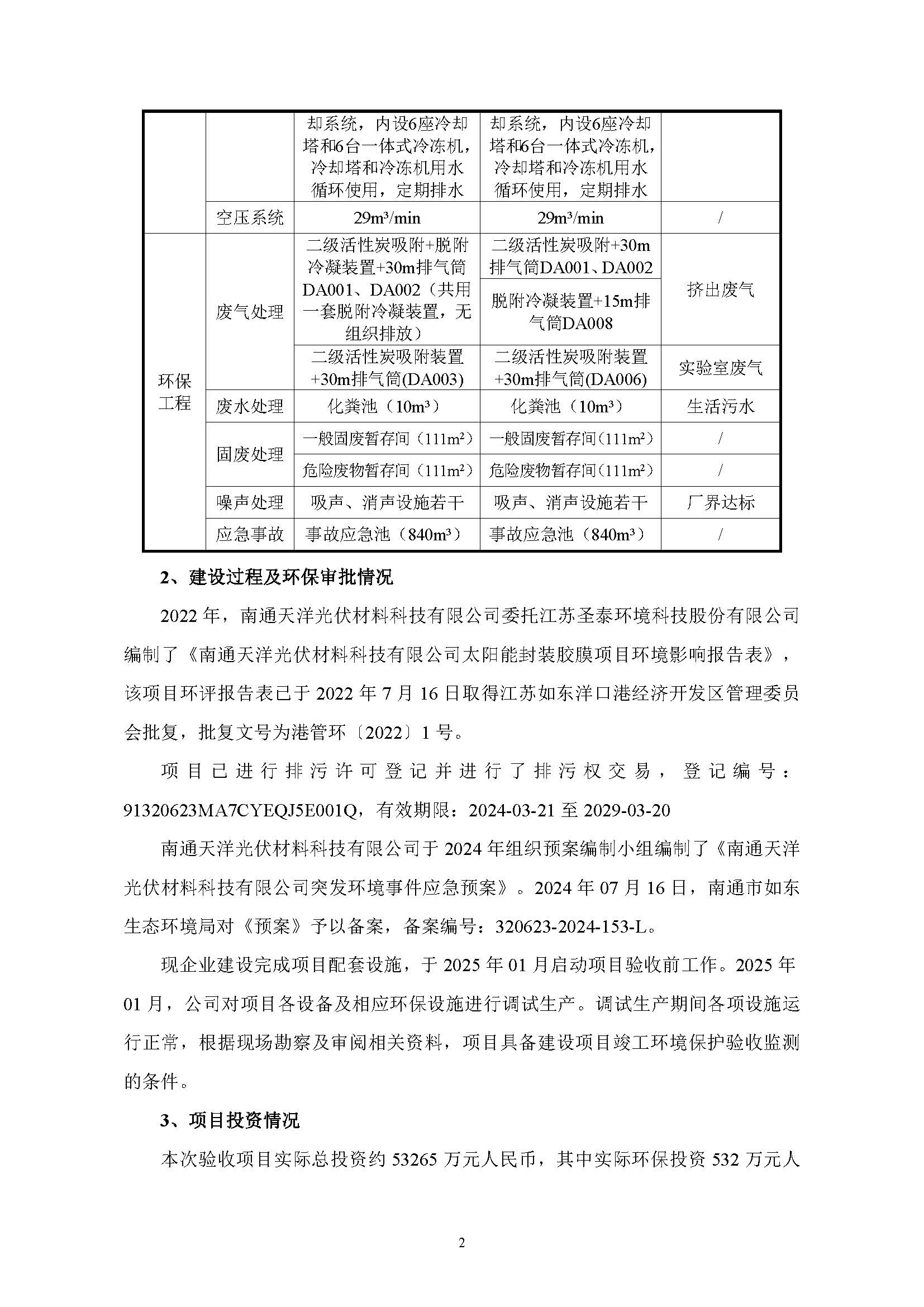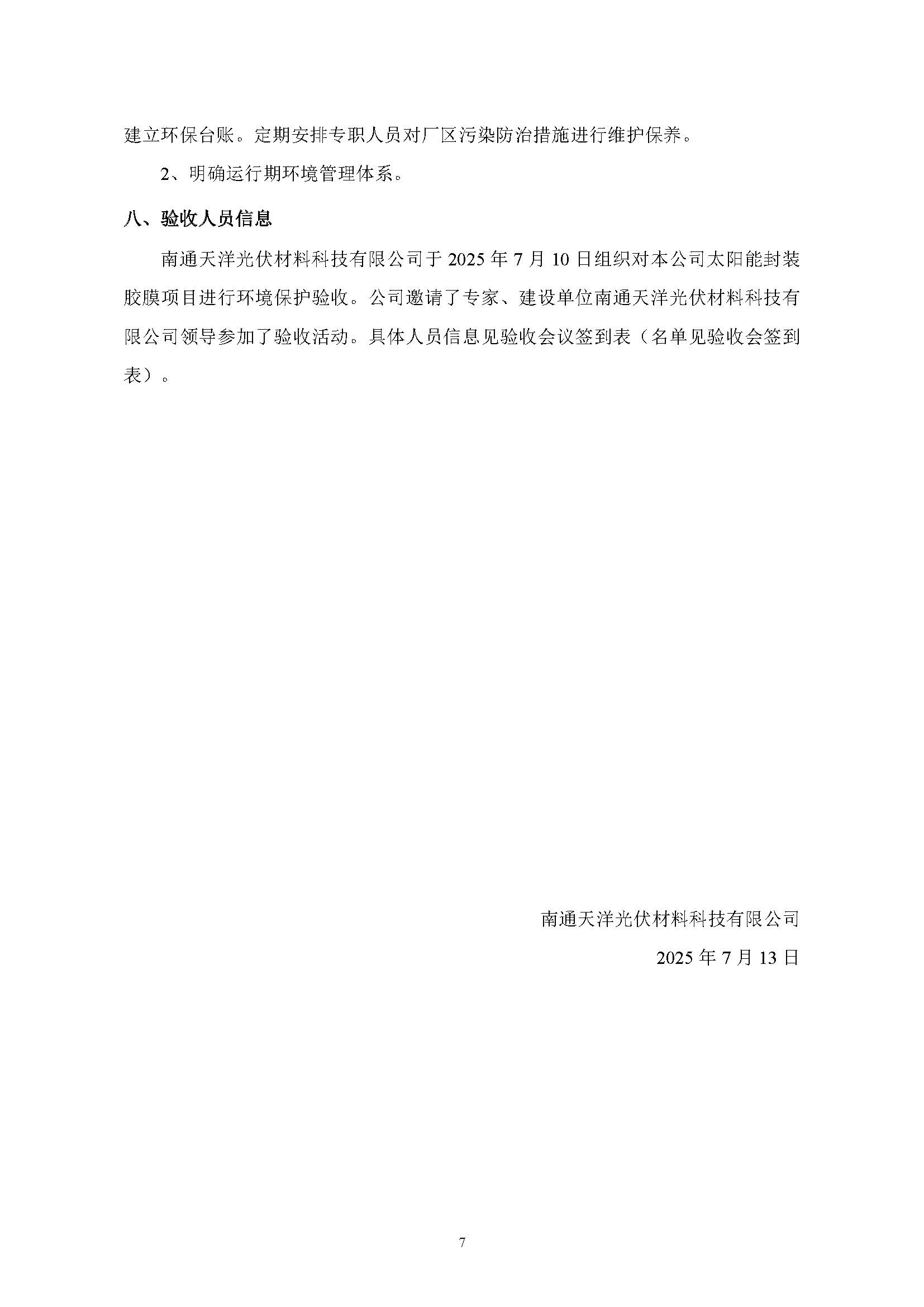 南通天洋光伏材料科技有限公司太阳能封装胶膜项目于2025年9月26日自主验收公示